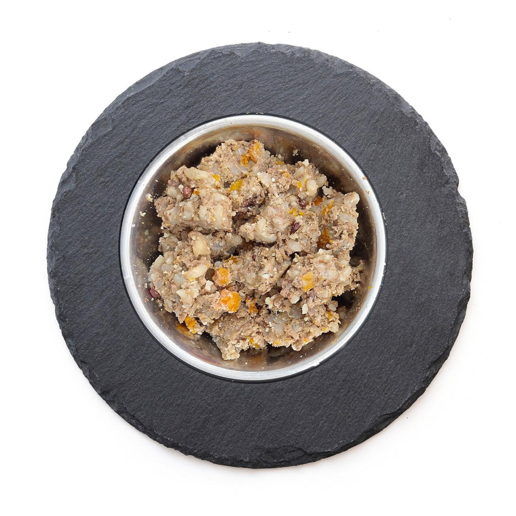 40% marhahús, 6,5% marhazöldpacal, 6,5% marhamáj, 6,5% marhaszív, 5% őrölt marhacsont, 4,5% marhavese, 9,5% sárgarépa, 7,5% barna rizs, 6% alma, 4% áfonya, 1,5% repceolaj, 1% csipkebogyó, 0,8% csukamájolaj, 0,5% tengeri mészkő, 0,2% tengeri algapor.